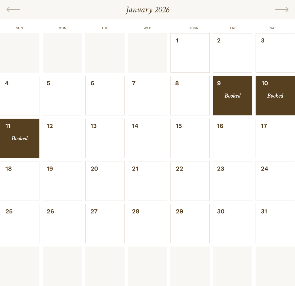 Discover the available dates for hosting your event at Oak Valley Estate. Use our calendar as a guide while you envision the experience we can help you create.